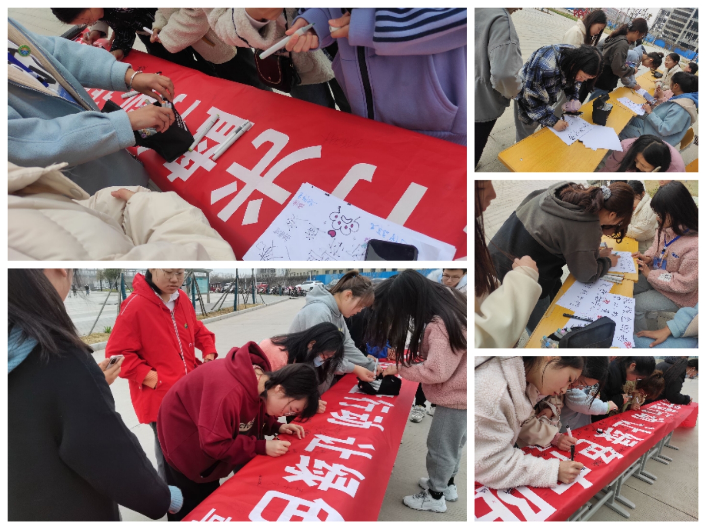 活动中,员工会成员在东校区的教学区A栋楼下、餐厅门口设置了条幅和签字笔,热情地向路过同学宣传和讲解,吸引了很多路过同学都纷纷主动签下自己名字,一起立志为环保做贡献。