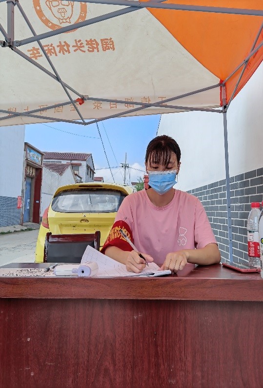 20级本科思想政治教育3班的韩宜霏同学,她积极参加了村里组织的各项志愿者活动。她主要负责的工作是在村口对进出人员登记,对进出村子的人员进行排查,并对周围环境进行消毒,助力疫苗接种工作的顺利开展,实际行动诠释着青年的奉献与担当。