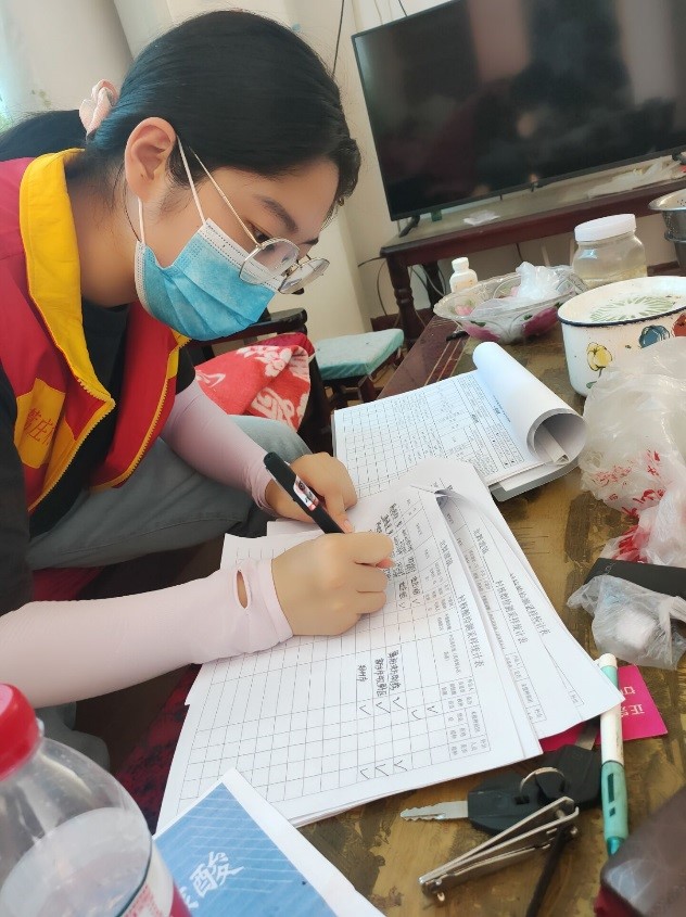 20级本科思想政治教育1班的王苗苗同学,在其所在地区也存有一例感染者,她积极报名成为了一名村里的志愿者。她与多名老员工、高中生组成的志愿者团队一同在疫情卡点处进行卡点执勤,并且挨家挨户进行走访排查,宣传防疫知识,防止人员聚集,有效的防止了疫情的进一步扩散。