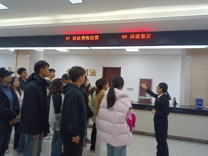 抵达武陟县人民法院后,在负责讲解的工作人员带领下,师生们首先参观了武陟县人民法院的办事大厅,大厅里人来人往,却又秩序井然,各个办事窗口的标识清晰醒目。工作人员耐心细致地为师生们介绍着每个办事窗口的具体业务范围,让师生们对法院的日常工作有了初步的认识。