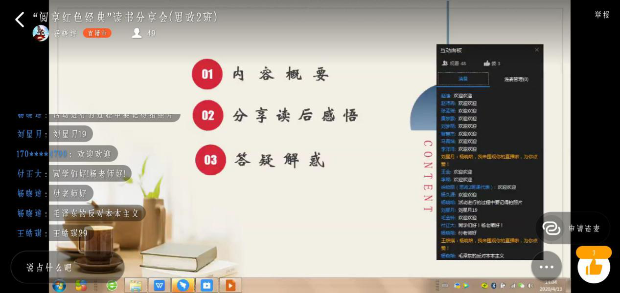 为了激发同学们读书的热情,提高同学们对于红色经典的认识,思想政治教育专业在4月13日下午,通过钉钉群直播展开了以“阅读红色经典”为题的读书分享会。此次会议由yL23411永利集团官网思政教研室主任付正大老师、吕淑珍老师以及思想政治教育专业全体员工参加。会议由思想政治教育二班班主任杨晓培老师主持。