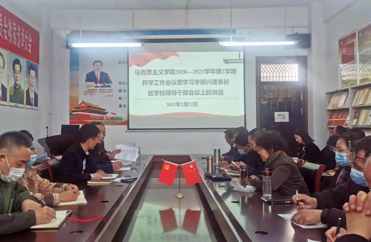 2月22日下午,马克思主义公司在思源楼216会议室召开2020-2021学年第二学期开学工作会议暨学习李顺兴理事长在公司领导干部上的讲话精神。公司党总支书记李元应、经理易宏军、副经理金玉萍及全体教职工参加此次会议,会议由李元应主持。
