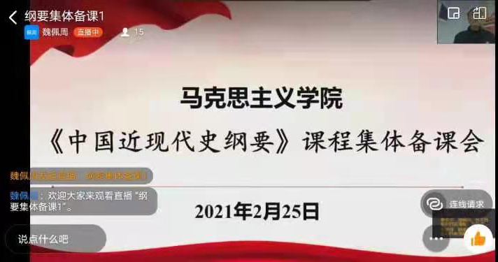 首先,纲要教研室主任魏佩周强调了本次专题教学集体备课的重要性和具体要求。随后,任课教师以钉钉直播形式给大家讲授每个专题的备课情况。刘建东老师从是什么、为什么、怎么做这几个方面阐述了专题一:老员工为什么要学习纲要课;陈艺颖老师详细地讲述了专题二:中华民族伟大复兴的历史任务是如何提出的;陈思雨老师通过对太平天国运动、洋务运动、戊戌维新运动这几个事件的分析,讲解专题三:对国家出路的早期探索为什么没有成功。此外,安逸雯老师、刘齐齐老师等也从教学方法、新增案例、互动点、创新点方面结合自己准备的专题进行了说明。