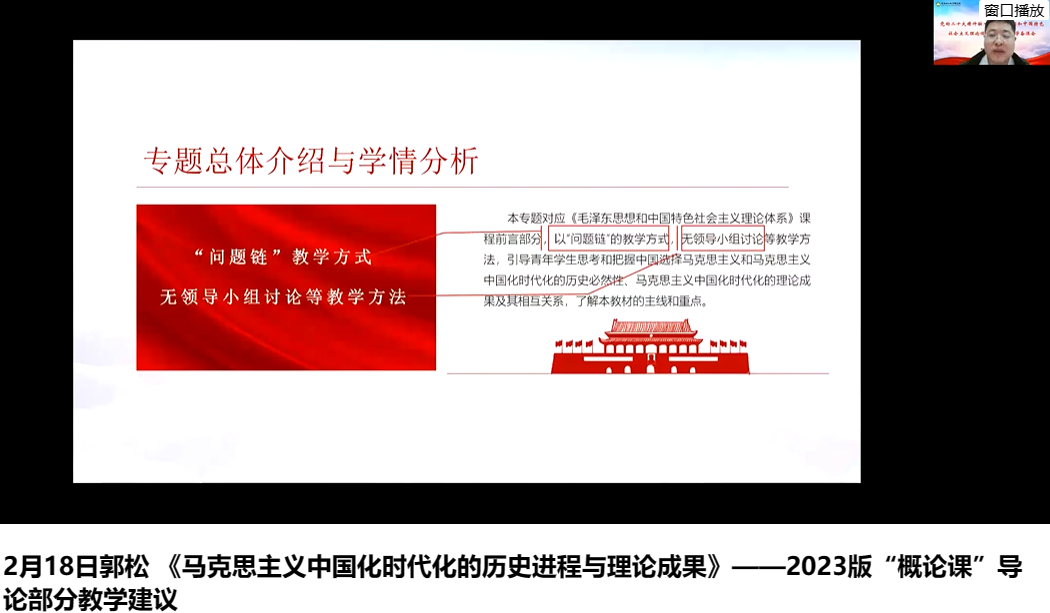 3月3日,河北经贸大学马院郭建教授对思政课教师的重要性、如何讲好《概论》课谈了自己的亲身体会,并对2023版概论教材的第七、八两章如何进行教学设计提出了几点教学建议。