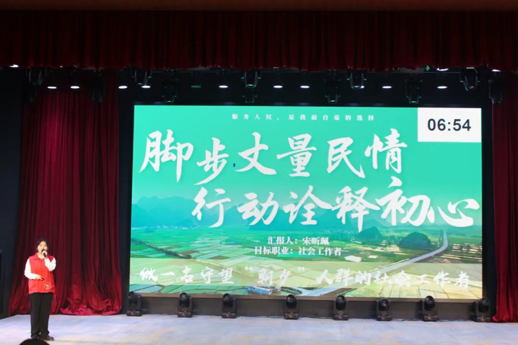 在比赛过程中,张琰妍选手阐述了自身特点,通过图表等形式讲解了当前特岗教师的就业趋势,并通过在校成绩、志愿服务、班委工作、支教经历等方面详细介绍了自身优势。在随后的评委问答环节,介绍了未来憧憬的就业地区——宁夏,渴望深入当地基层教学,为孩子们送去知识与温暖;宋昕珮选手以花自喻,从“了解种子”、“花儿萌芽”、“生长绽放”、“为花除虫”四个方面阐述了对社会工作者的热爱与就业优势,详细介绍了自身社会实践的成果,并通过采访模范前辈的方式,了解了社会工作领域的难点。