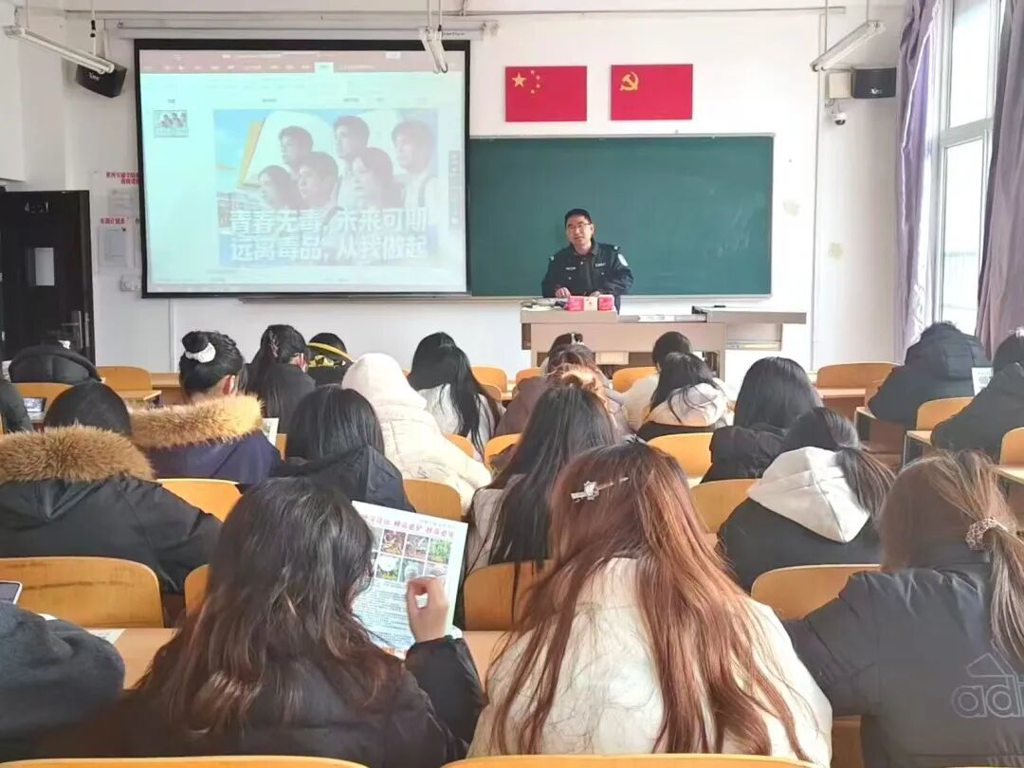 活动伊始,公安人员为同学们分发了禁毒宣传手册,随即展开与同学们了有关“毒品危害知多少”的简单互动,接着详细介绍了毒品的定义以及分类,并且传授给大家一些简单的辨认毒品的方法,随后公安人员借助动画演示,用通俗的语言解释了吸毒会上瘾的原因,让同学们切实体会到吸毒对身体带来的危害,最后公安人员着重介绍了青少年防止吸毒的措施,包括不随意结识社会不良人员,不轻易接受陌生人递来的物品,不轻信社会不良人员的哄骗,尤其强调青少年首先自己要意志坚定、珍爱生命,知道毒品对个人、家庭、社会、国家带来的重要危害。在讲解禁毒知识的同时,公安人员也将普法宣传贯穿始终,结合社会上吸毒犯罪判决案例,让同学们深刻意识到法律的威严。活动现场气氛良好,同学们积极参与互动。